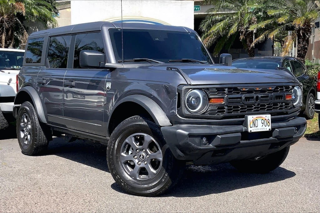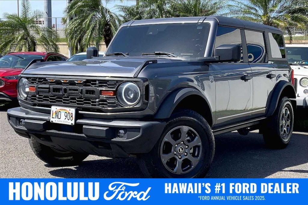 HONOLULU FORD! 808-532-1700, *DONT WAIT! CALL NOW!!, FINANCING AVAILABLE, GUARANTEED APPROVALS! LOW PAYMENTS! GREAT INTEREST RATES!, ***FORD CERTIFIED VEHICLE!! 172 POINT INSPECTION, OIL CHANGE, NEW WIPERS, NEW AIR FILTERS, FULL DET, WE SHIP TO NEIGHBOR ISLANDS!, 172 POINT INSPECTION BY FACTORY TRAINED TECHNICIANS!, STATE SAFETY INSPECTION COMPLETE!, APPLE CAR PLAY/ANDROID AUTO, BLUETOOTH HANDS FREE CALLING, ONE OWNER!!, ACCIDENT FREE CARFAX!, BACK-UP CAMERA, EXTRA CLEAN, WELL TAKEN CARE OF, EXCELLENT CONDITION!, EXCELLENT SERVICE HISTORY!!, READY FOR YOU TO DRIVE HOME TODAY!, UPGRADED WHEELS, TOUCH SCREEN, 4-Wheel Disc Brakes, 7 Speakers, ABS brakes, Air Conditioning, AM/FM radio: SiriusXM with 360L, AM/FM Stereo, Auto High-beam Headlights, Brake assist, Carbonized Gray Molded-In-Color Hard Top, Compass, Delay-off headlights, Driver door bin, Driver vanity mirror, Dual front impact airbags, Dual front side impact airbags, Electronic Stability Control, Emergency communication system: 911 Assist, Exterior Parking Camera Rear, Front anti-roll bar, Front Bucket Seats, Front Center Armrest, Front reading lights, Front Row Top Panels Storage Bag, Front wheel independent suspension, Fully automatic headlights, Heated door mirrors, Illuminated entry, Integrated roll-over protection, Low tire pressure warning, Occupant sensing airbag, Outside temperature display, Overhead airbag, Overhead console, Panic alarm, Passenger door bin, Passenger vanity mirror, Power door mirrors, Power steering, Power windows, Radio data system, Radio: 6 Speakers w/Subwoofer Delete, Remote keyless entry, Security system, SiriusXM Radio w/360L, Speed control, Split folding rear seat, Steering wheel mounted audio controls, SYNC 4, Tachometer, Telescoping steering wheel, Tilt steering wheel, Traction control, Trip computer, Variably intermittent wipers, 4-Wheel Drive/All-Wheel Drive. Recent Arrival! CARFAX One-Owner. Clean CARFAX. Carbonized Gray Metallic 2023 Ford Bronco Big Bend 4WD 7-Speed Manual 2.3L EcoBoost I-4