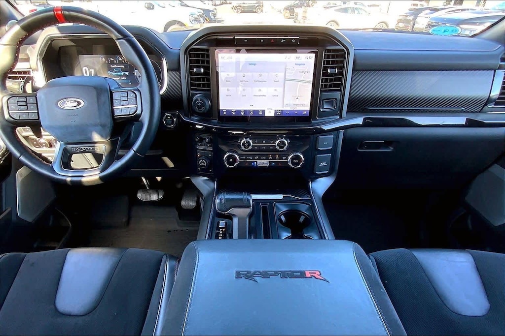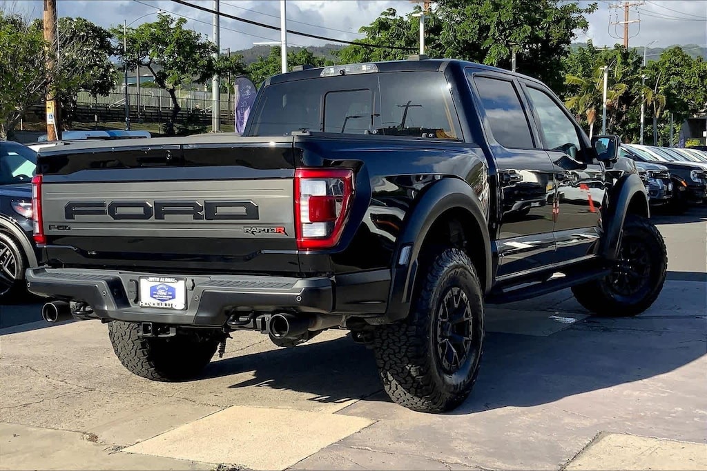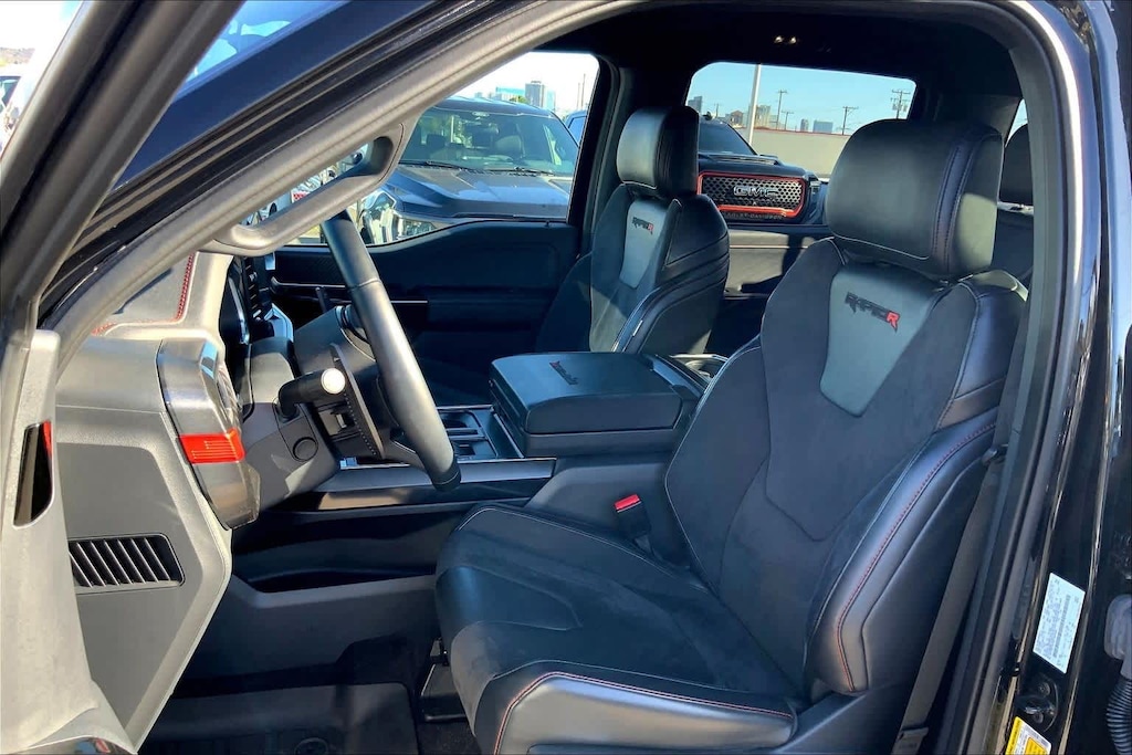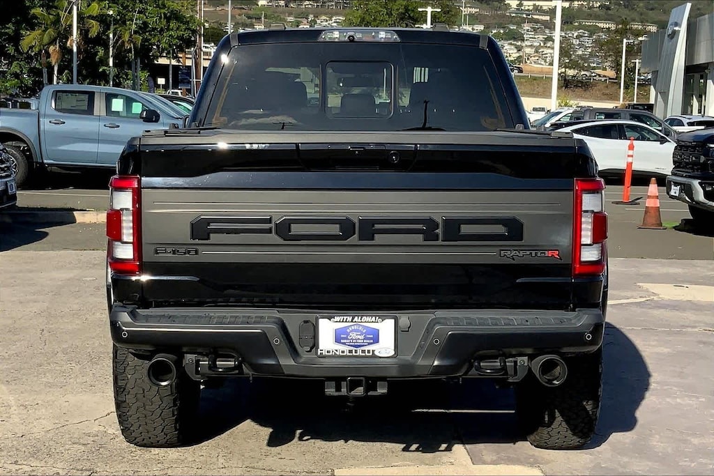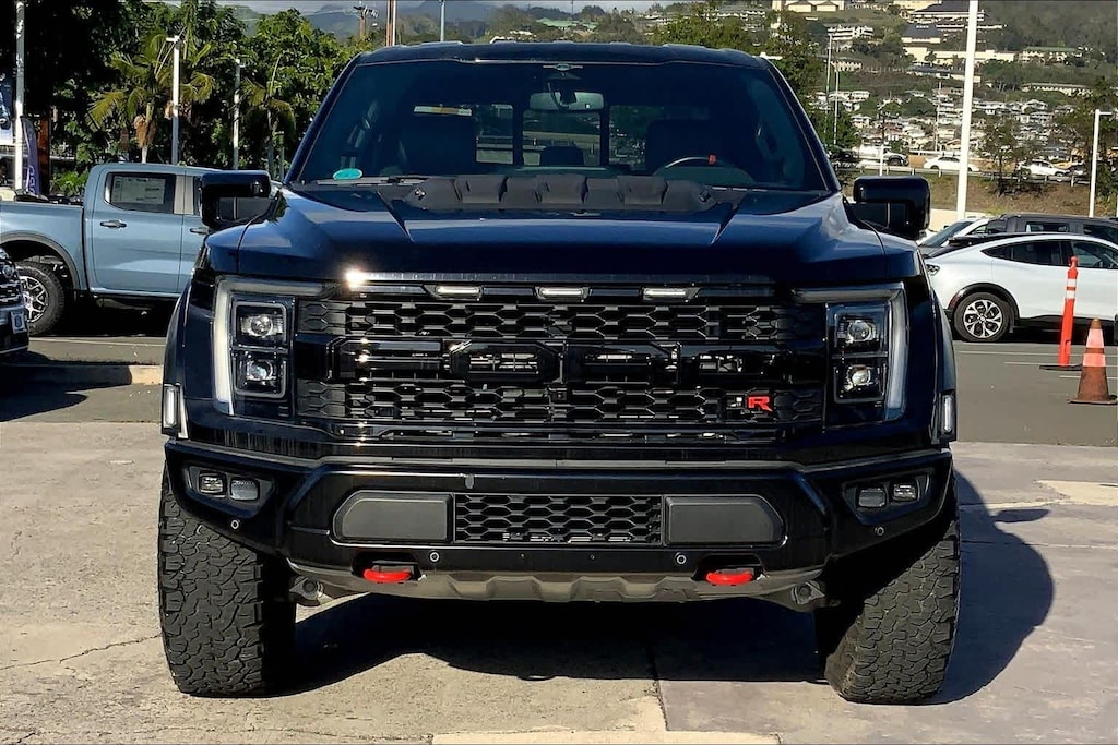 HONOLULU FORD! 808-532-1700, 4WD, 17 Cast Aluminum Wheels, 17 Forged Aluminum Bead-Lock Capable Wheels, 18 Speakers, 4-Wheel Disc Brakes, ABS brakes, Adaptive suspension, Adjustable pedals, Air Conditioning, Alloy wheels, AM/FM radio: SiriusXM with 360L, Auto High-beam Headlights, Auto Start-Stop Removal (DISC), Auto tilt-away steering wheel, Auto-dimming door mirrors, Auto-dimming Rear-View mirror, Automatic temperature control, Black Exterior Accents, Brake assist, Bumpers: body-color, Carbon Fiber Interior Appliques, Code Orange Stitching Doors & Instrument Panel, Code Orange Tow Hooks, Compass, Delay-off headlights, Driver door bin, Driver vanity mirror, Dual front impact airbags, Dual front side impact airbags, Electronic Locking w/4.10 Axle Ratio, Electronic Stability Control, Emergency communication system, Equipment Group 802A Raptor R, Exterior Parking Camera Rear, Front anti-roll bar, Front Bucket Seats, Front Center Armrest, Front dual zone A/C, Front fog lights, Front reading lights, Front wheel independent suspension, Fully automatic headlights, Garage door transmitter, GVWR: 7,300 lbs Payload Package, GVWR: 7,450 lbs Payload Package, Heated door mirrors, Heated front seats, Heated rear seats, Heated steering wheel, Illuminated entry, Inclination/Intrusion Sensor Removal, Interior Code Orange Raptor R Badging, Lane Departure Warning System, Leather Trim Seats w/Heated 2nd Row, Low tire pressure warning, Memory seat, Navigation system: Connected Navigation, Occupant sensing airbag, Outside temperature display, Overhead airbag, Overhead console, Panic alarm, Partitioned Lockable Fold-Flat Storage, Passenger door bin, Passenger vanity mirror, Pedal memory, Power door mirrors, Power driver seat, Power passenger seat, Power steering, Power windows, Radio data system, Radio: B&O Unleashed Sound System by Bang & Olufsen, Rain sensing wipers, Raptor 37 Graphics, Raptor 37 Graphics Delete, Raptor R Badge Tailgate Applique, Rear reading lights, Rear step bumper, Rear window defroster, Recaro Black w/Orange Stitching Front Seats, Remote keyless entry, Security system, Speed control, Speed-sensing steering, Split folding rear seat, Steering Wheel Heat Removal (DISC), Steering wheel memory, Steering wheel mounted audio controls, SYNC 4 w/Enhanced Voice Recognition, Tachometer, Telescoping steering wheel, Tilt steering wheel, Traction control, Trip computer, Turn signal indicator mirrors, Unique Hood Vent w/R Badge, Unique Raptor R Grille w/R Badge, Variably intermittent wipers, Ventilated front seats, Wheels: Unique 17 Forged Aluminum Bead-Lock Capable, 4WD. Recent Arrival! CARFAX One-Owner. Clean CARFAX. Agate Black Metallic 2023 Ford F-150 Raptor 4WD 10-Speed Automatic 5.2L V8