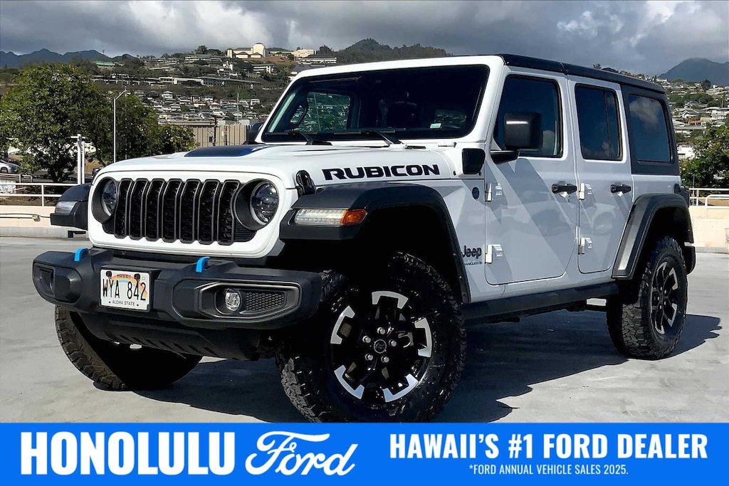 HONOLULU FORD! 808-532-1700, *DONT WAIT! CALL NOW!!, FINANCING AVAILABLE, GUARANTEED APPROVALS! LOW PAYMENTS! GREAT INTEREST RATES!, ***FORD CERTIFIED VEHICLE!! 172 POINT INSPECTION, OIL CHANGE, NEW WIPERS, NEW AIR FILTERS, FULL DET, WE SHIP TO NEIGHBOR ISLANDS!, 172 POINT INSPECTION BY FACTORY TRAINED TECHNICIANS!, STATE SAFETY INSPECTION COMPLETE!, APPLE CAR PLAY/ANDROID AUTO, BLUETOOTH HANDS FREE CALLING, ONE OWNER!!, ACCIDENT FREE CARFAX!, LIFTED/LIFT/LIFT KIT, BACK-UP CAMERA, EXTRA CLEAN, WELL TAKEN CARE OF, EXCELLENT FUEL ECONOMY, OFF ROAD WHEELS AND TIRES, EXCELLENT CONDITION!, EXCELLENT SERVICE HISTORY!!, ADAPTIVE CRUISE CONTROL, PARKING SENSORS, UPGRADED WHEELS, TOUCH SCREEN, 2.0L I4 DOHC, 12.3 Touchscreen Display, 4-Wheel Disc Brakes, 4.10 Rear Axle Ratio, 4G LTE Wi-Fi Hot Spot, 8 Speakers, ABS brakes, Air Conditioning, Alloy wheels, AM/FM radio: SiriusXM, Apple CarPlay, Apple CarPlay/Android Auto, Automatic temperature control, Black 3-Piece Hard Top, Brake assist, Compass, Connectivity - US/Canada, Delay-off headlights, Disassociated Touchscreen Display, Driver door bin, Driver vanity mirror, Dual front impact airbags, Dual front side impact airbags, Electronic Stability Control, Emergency communication system: Jeep Connect, Freedom Panel Storage Bag, Front anti-roll bar, Front Bucket Seats, Front Center Armrest w/Storage, Front dual zone A/C, Front fog lights, Front License Plate Bracket, Front reading lights, Fully automatic headlights, Google Android Auto, Heated door mirrors, Illuminated entry, Integrated Center Stack Radio, Integrated roll-over protection, Integrated Voice Command w/Bluetooth, Low tire pressure warning, No Soft Top, Occupant sensing airbag, Outside temperature display, Overhead airbag, Panic alarm, ParkView Rear Back-Up Camera, Passenger door bin, Passenger vanity mirror, Performance Suspension, Power door mirrors, Power steering, Power windows, Quick Order Package 29V Rubicon, Radio data system, Radio: Uconnect 5 w/12.3 Display, Rear anti-roll bar, Rear reading lights, Rear Window Defroster, Rear Window Wiper/Washer, Remote keyless entry, Security system, Speed control, Split folding rear seat, Steering wheel mounted audio controls, Sustainable Premium Cloth Seats, Tachometer, Telescoping steering wheel, Tilt steering wheel, Traction control, Trip computer, Variably intermittent wipers, Voltmeter, Wheels: 17 x 7.5 Machined w/Black Pockets, 2.0L I4 DOHC. Recent Arrival! CARFAX One-Owner. Clean CARFAX. Bright White Clearcoat 2024 Jeep Wrangler Rubicon 4xe 4WD 8-Speed Automatic 2.0L I4 DOHC