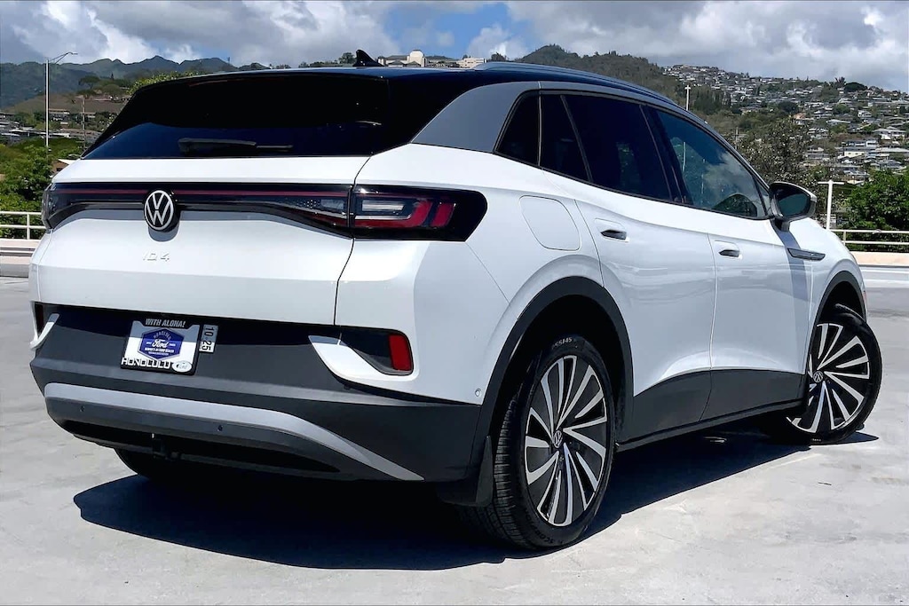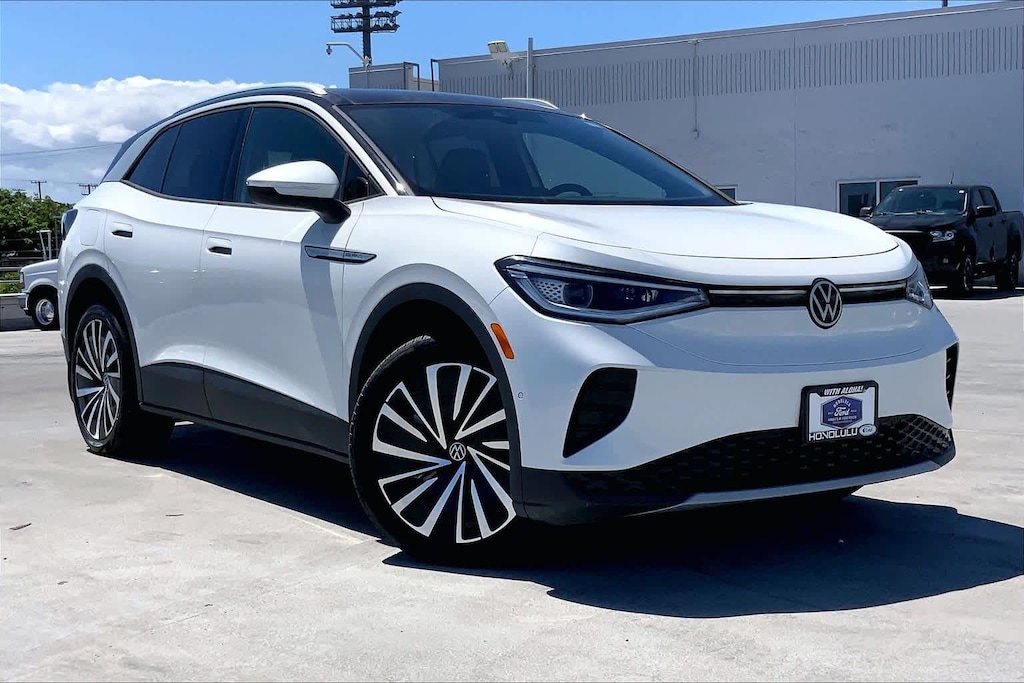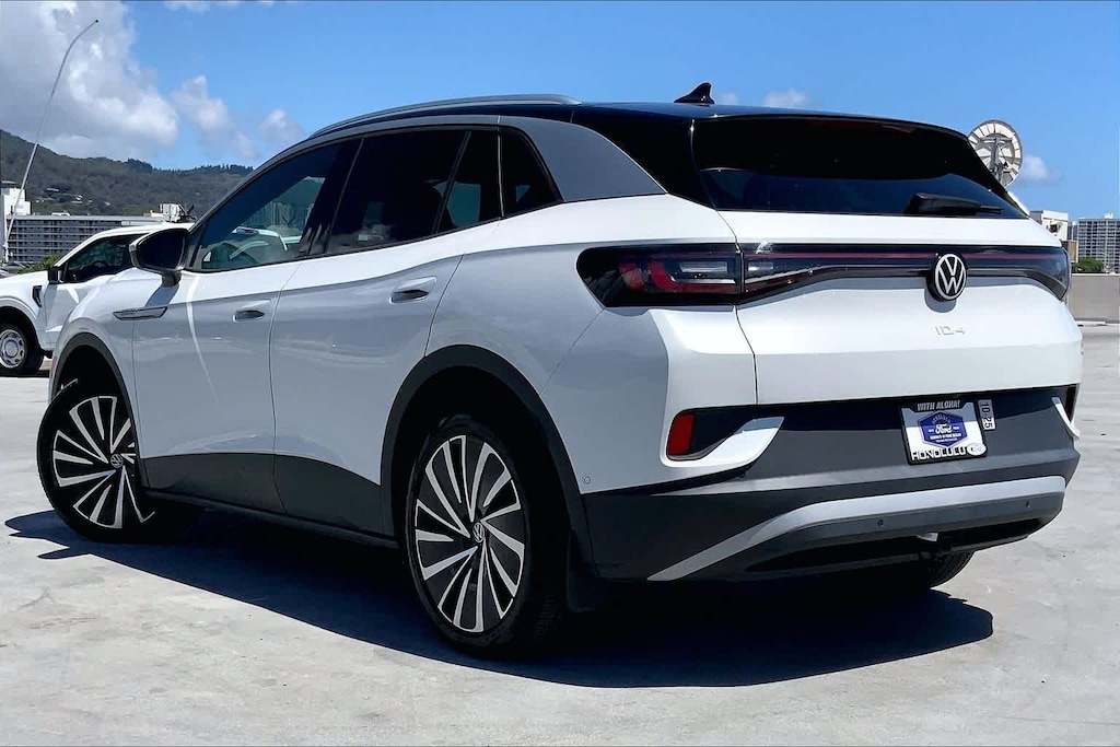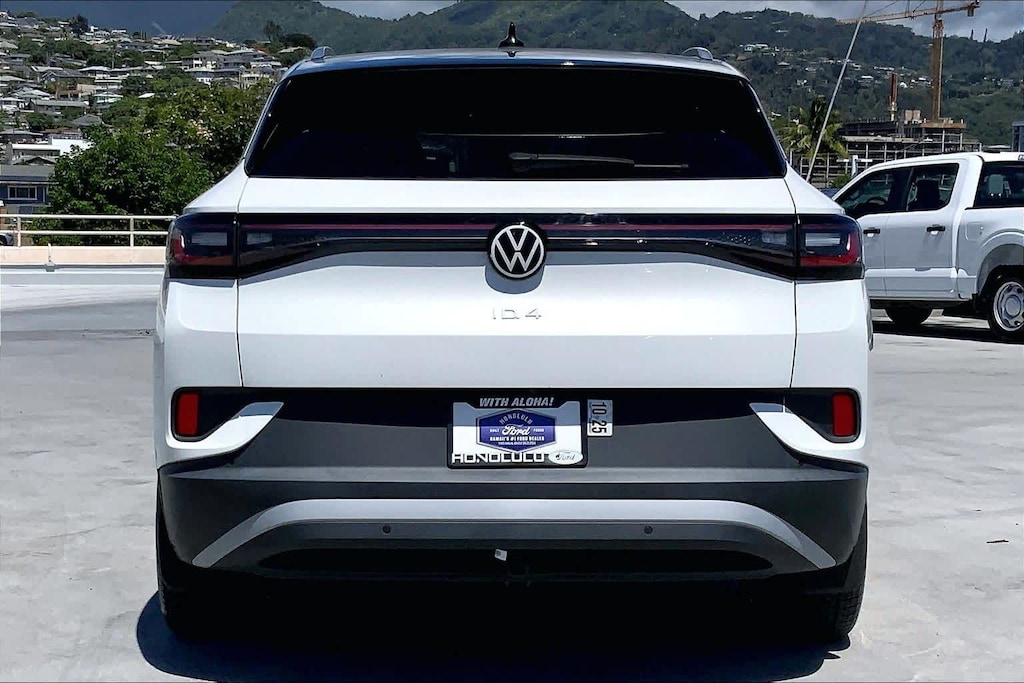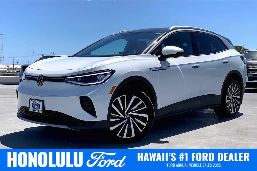 HONOLULU FORD! 808-532-1700, *DONT WAIT! CALL NOW!!, FINANCING AVAILABLE, GUARANTEED APPROVALS! LOW PAYMENTS! GREAT INTEREST RATES!, 3.90 Axle Ratio, 4 Wheel Independent Suspension, 7 Speakers, ABS brakes, Air Conditioning, Alloy wheels, Auto High-beam Headlights, Auto-dimming Rear-View mirror, Automatic temperature control, Brake assist, Bumpers: body-color, Delay-off headlights, Driver door bin, Driver vanity mirror, Drivers Seat Mounted Armrest, Dual front impact airbags, Dual front side impact airbags, Electronic Stability Control, Emergency communication system: VW Car-Net Safe & Secure 5-year, Exterior Parking Camera Rear, Four wheel independent suspension, Front anti-roll bar, Front Bucket Seats, Front dual zone A/C, Front fog lights, Front reading lights, Fully automatic headlights, Heated door mirrors, Heated Front Seats, Heated front seats, Heated rear seats, Heated steering wheel, Illuminated entry, Low tire pressure warning, Memory seat, Navigation System, Occupant sensing airbag, Outside temperature display, Overhead airbag, Overhead console, Panic alarm, Passenger door bin, Passenger seat mounted armrest, Passenger vanity mirror, Perforated V-Tex Leatherette Seating Surfaces, Power door mirrors, Power driver seat, Power Liftgate, Power passenger seat, Power steering, Power windows, Radio data system, Rain sensing wipers, Rear air conditioning, Rear anti-roll bar, Rear reading lights, Rear seat center armrest, Rear window defroster, Rear window wiper, Remote keyless entry, Speed control, Speed-sensing steering, Split folding rear seat, Spoiler, Steering wheel mounted audio controls, Telescoping steering wheel, Tilt steering wheel, Traction control, Trip computer, Turn signal indicator mirrors, Variably intermittent wipers, Wheels: 20 Dynamic Design 2-Tone Machined Alloy, 4-Wheel Drive/All-Wheel Drive. Recent Arrival! 2023 Volkswagen ID.4 Pro S Plus AWD Single-Speed Automatic Electric Motor